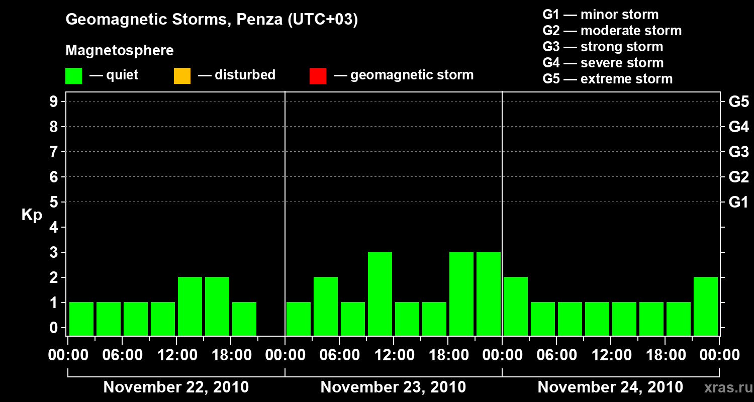 Changes in the geomagnetic index Kp from November 22 to 24, 2010 for mid latitudes