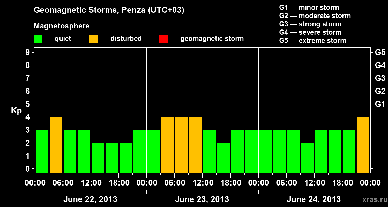 Changes in the geomagnetic index Kp from June 22 to 24, 2013 for mid latitudes