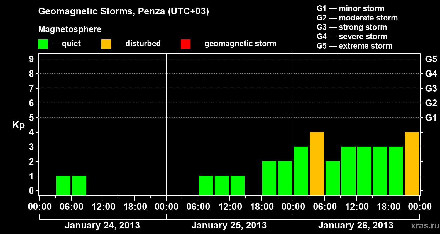 Changes in the geomagnetic index Kp from January 24 to 26, 2013 for mid latitudes