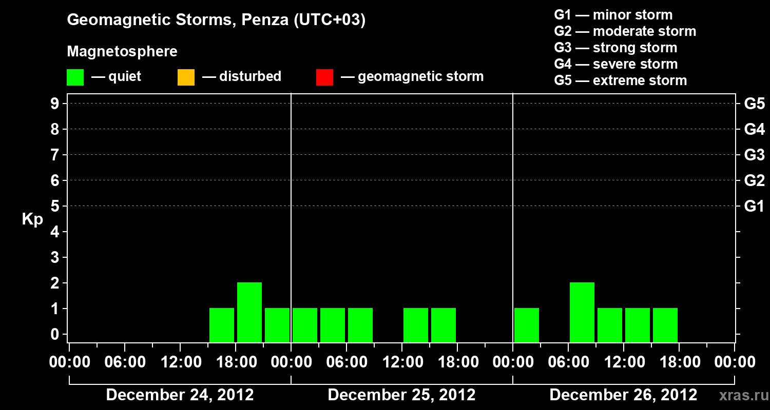 Changes in the geomagnetic index Kp from December 24 to 26, 2012 for mid latitudes