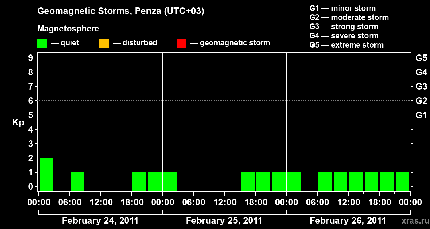 Changes in the geomagnetic index Kp from February 24 to 26, 2011 for mid latitudes