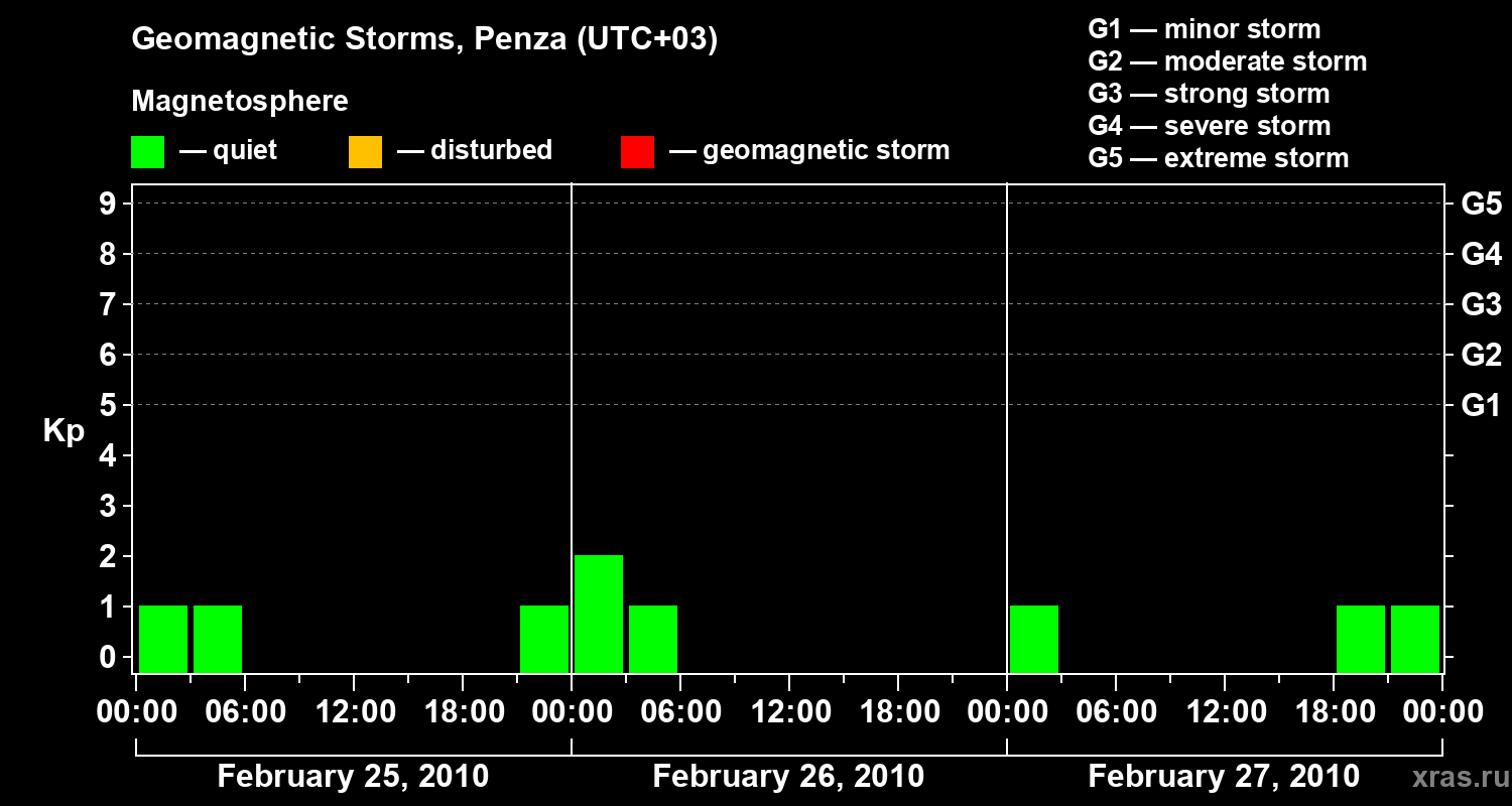 Changes in the geomagnetic index Kp from February 25 to 27, 2010 for mid latitudes