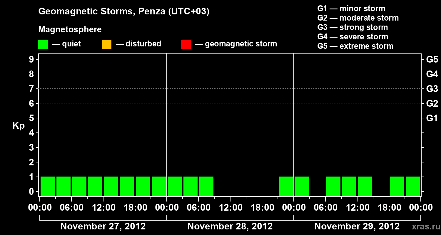 Changes in the geomagnetic index Kp from November 27 to 29, 2012 for mid latitudes
