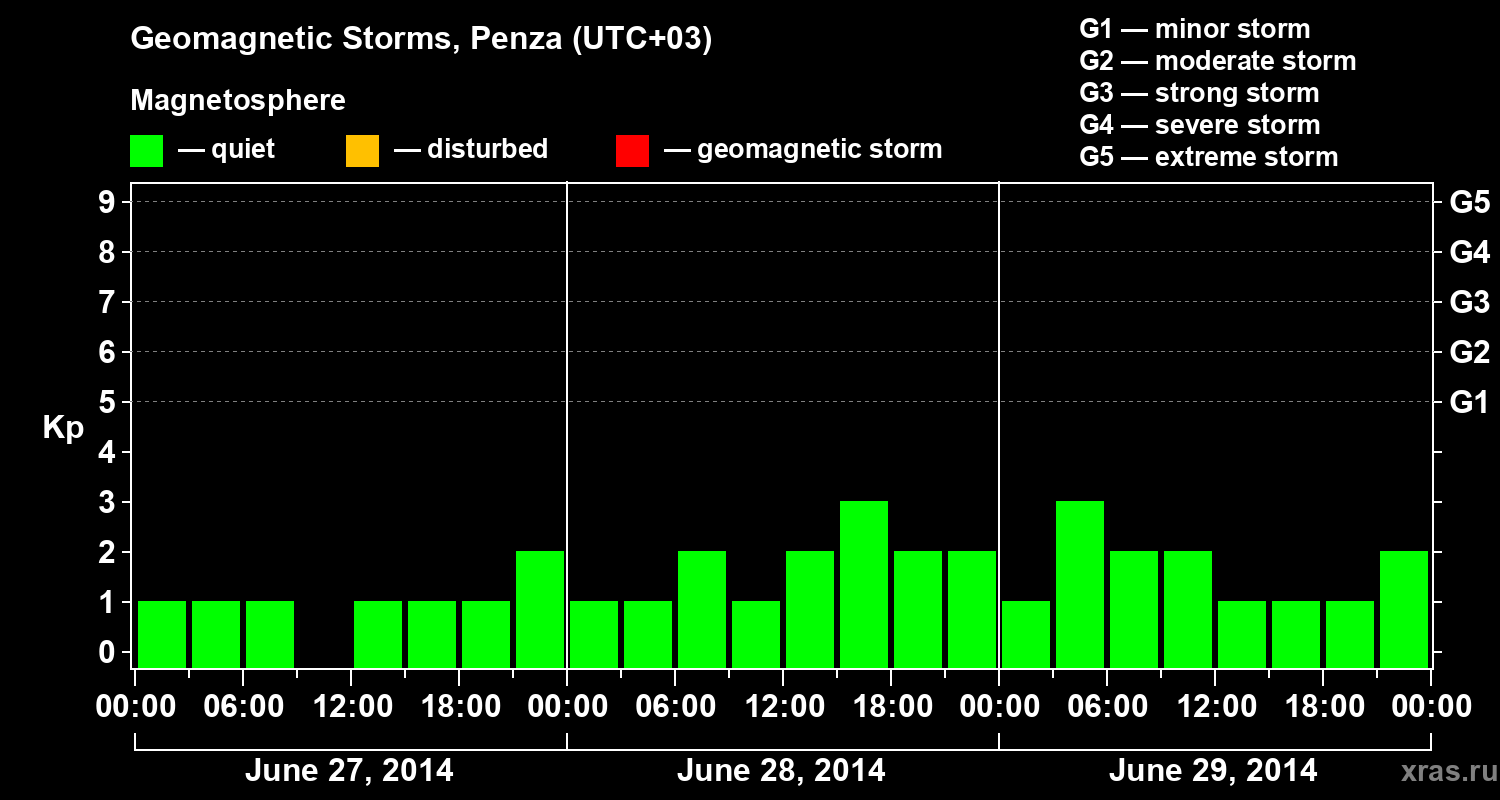 Changes in the geomagnetic index Kp from June 27 to 29, 2014 for mid latitudes