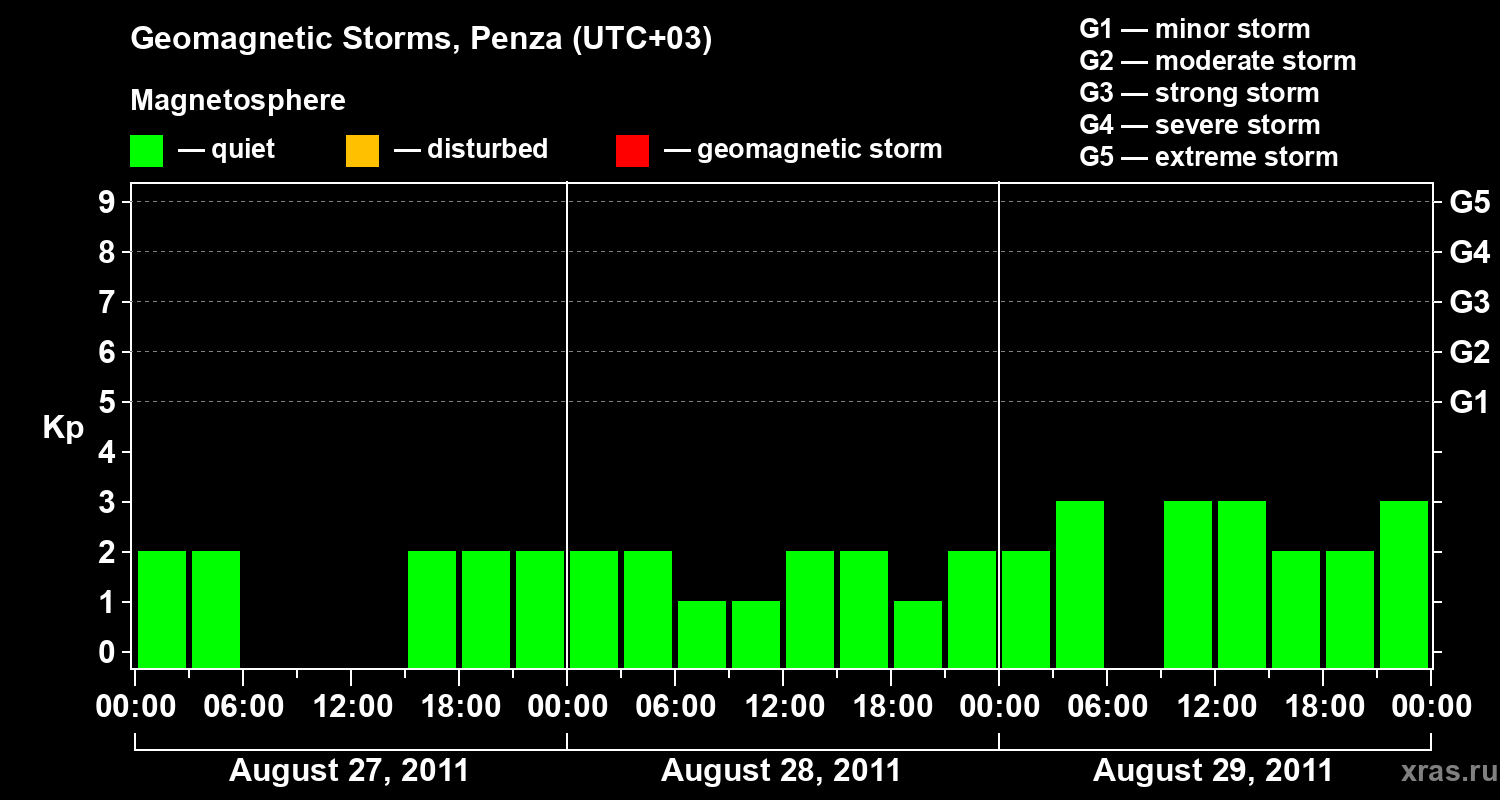 Changes in the geomagnetic index Kp from August 27 to 29, 2011 for mid latitudes