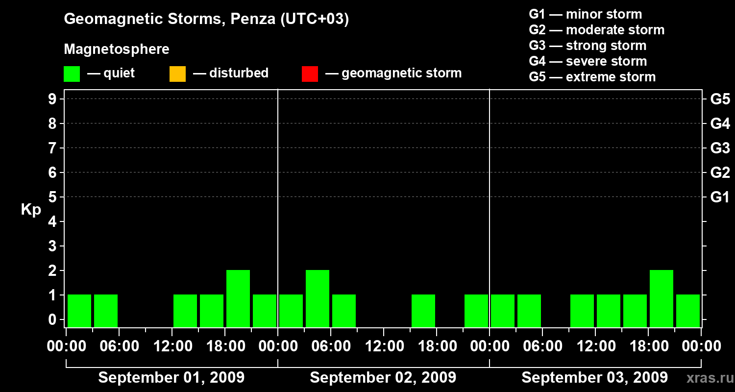 Changes in the geomagnetic index Kp from September 1 to 3, 2009 for mid latitudes