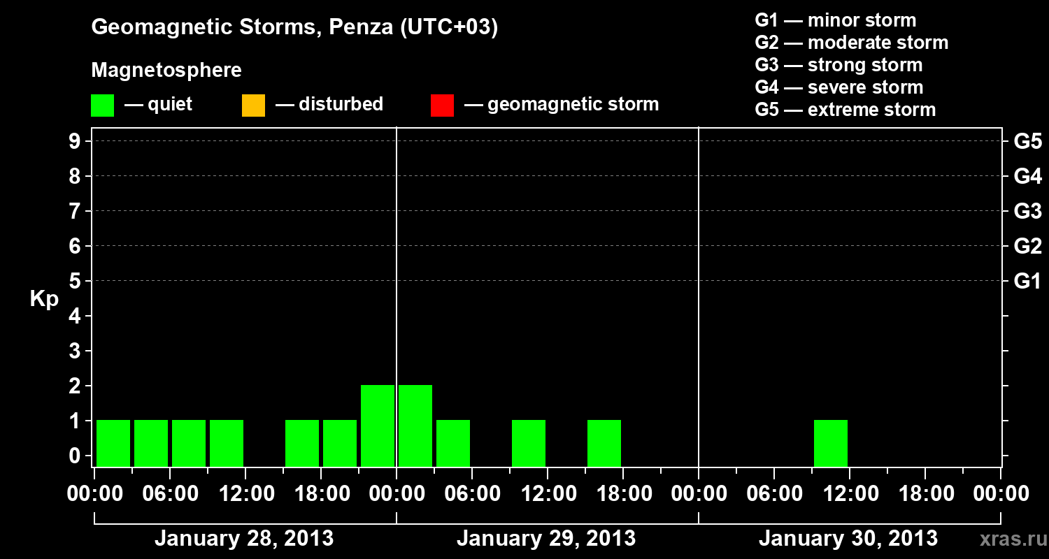 Changes in the geomagnetic index Kp from January 28 to 30, 2013 for mid latitudes