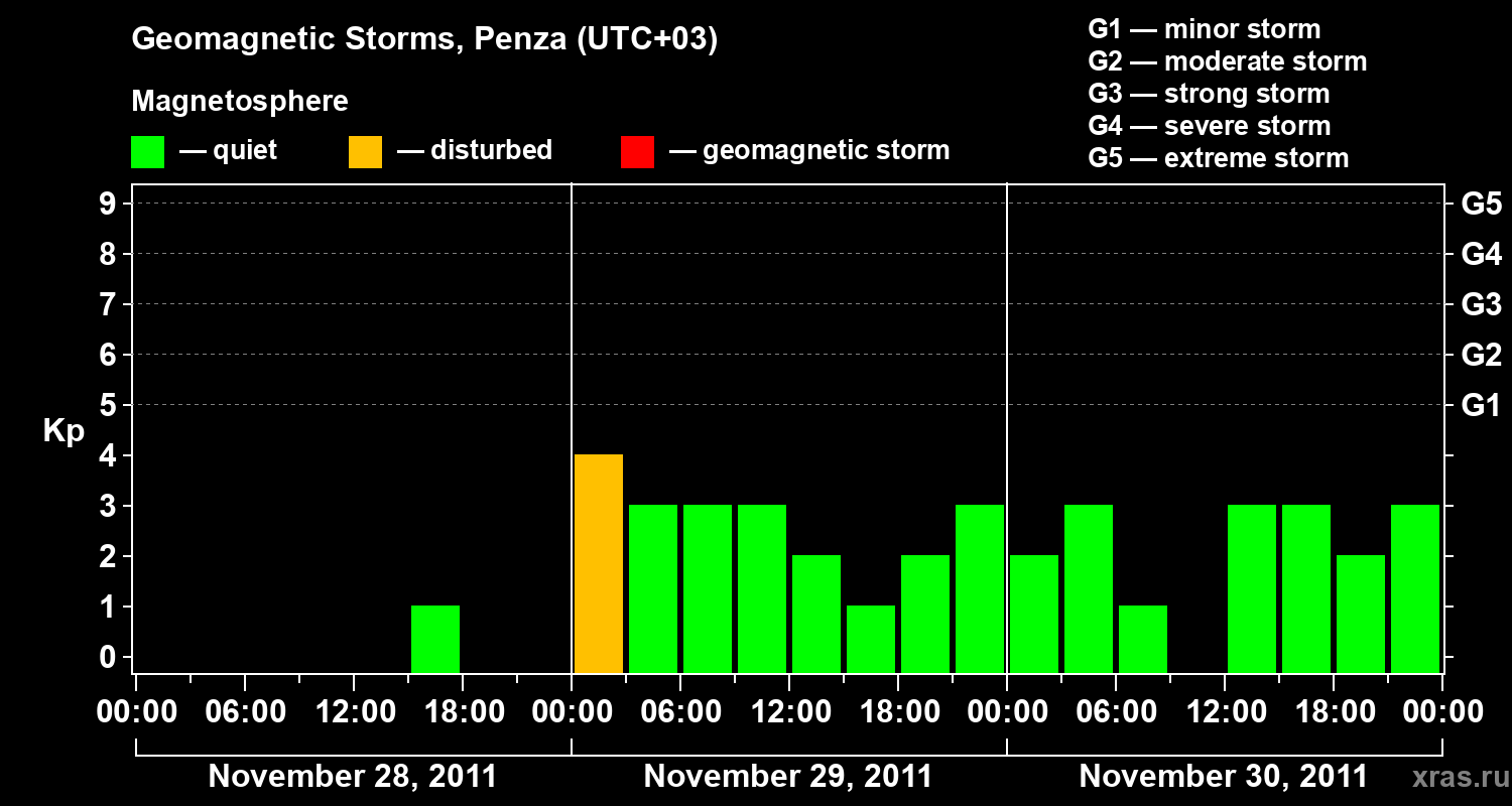 Changes in the geomagnetic index Kp from November 28 to 30, 2011 for mid latitudes