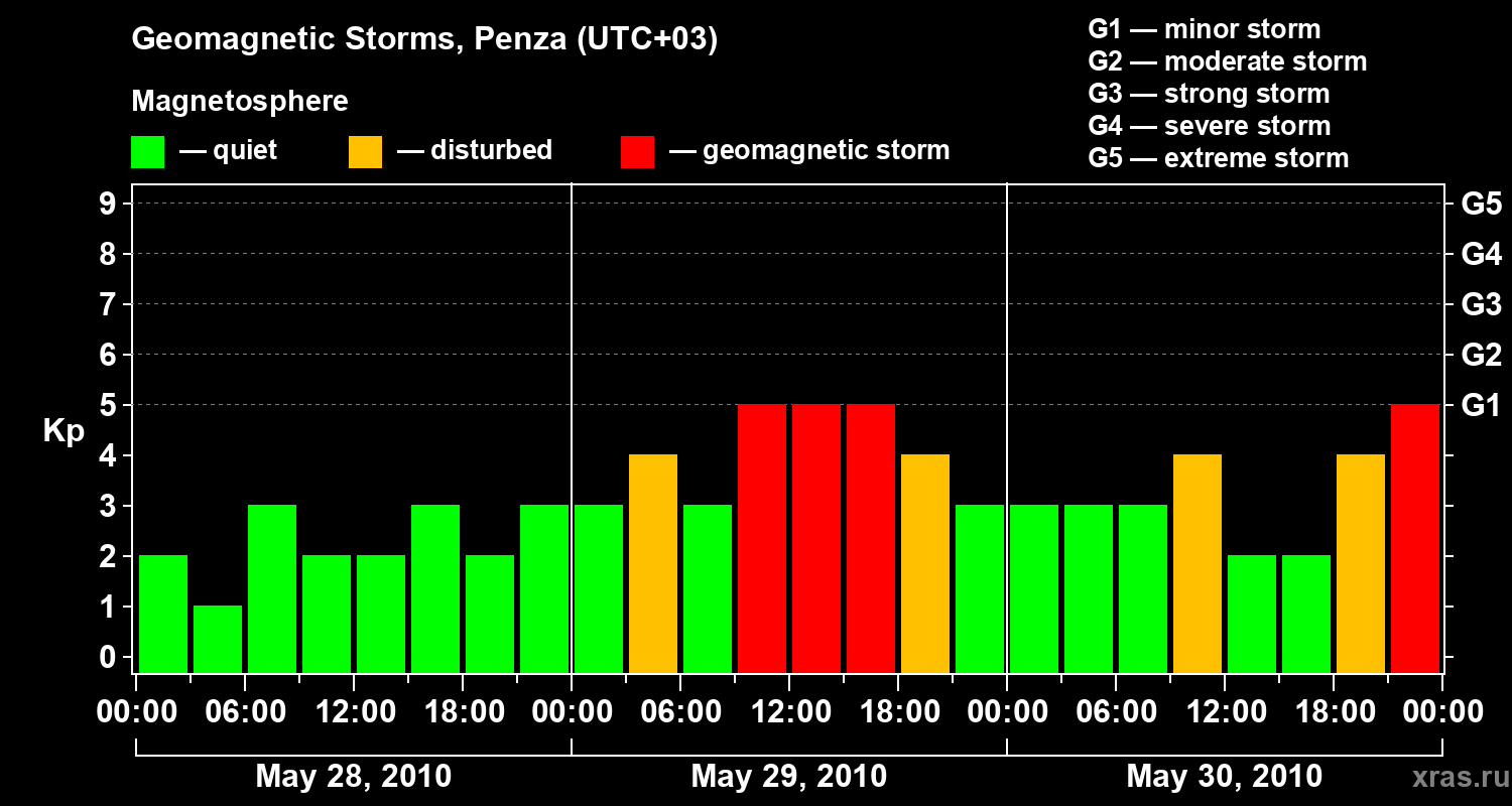 Changes in the geomagnetic index Kp from May 28 to 30, 2010 for mid latitudes