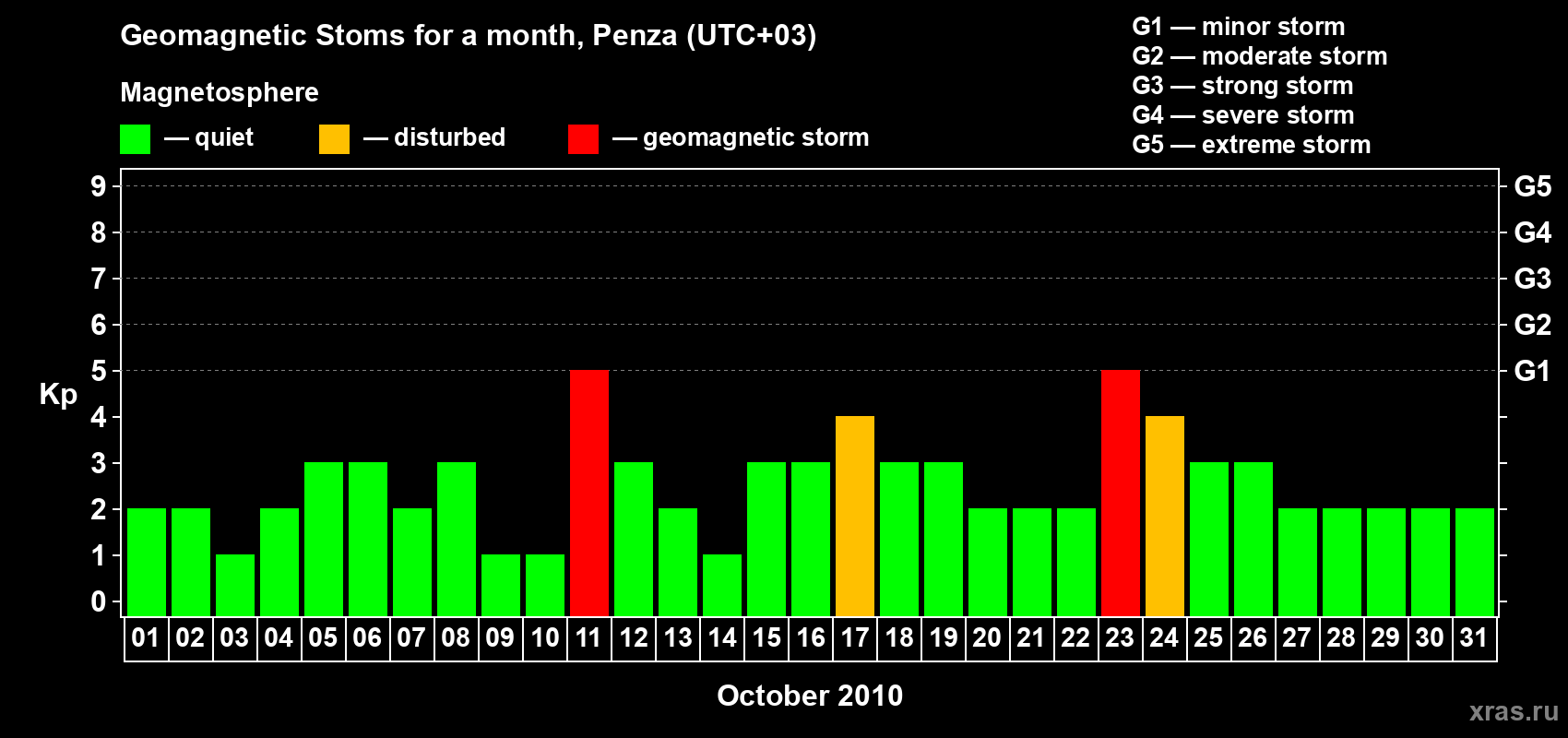 Changes in the maximum daily geomagnetic index Kp in October 2010 for mid latitudes