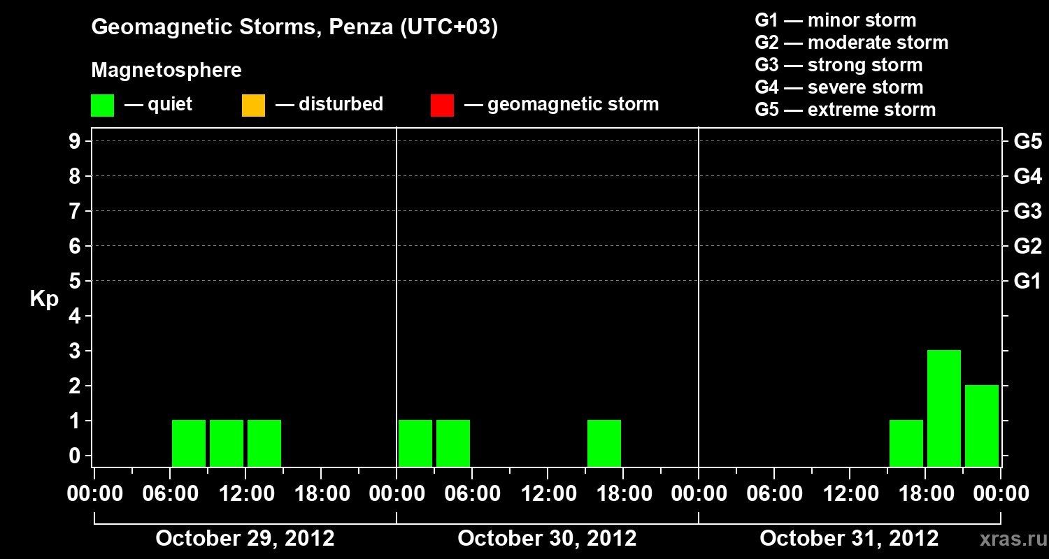Changes in the geomagnetic index Kp from October 29 to 31, 2012 for mid latitudes
