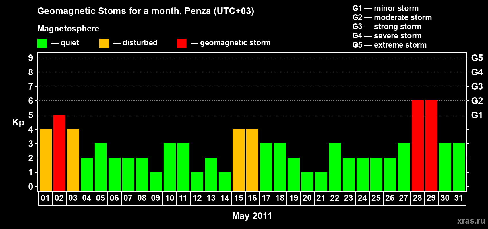 Changes in the maximum daily geomagnetic index Kp in May 2011 for mid latitudes