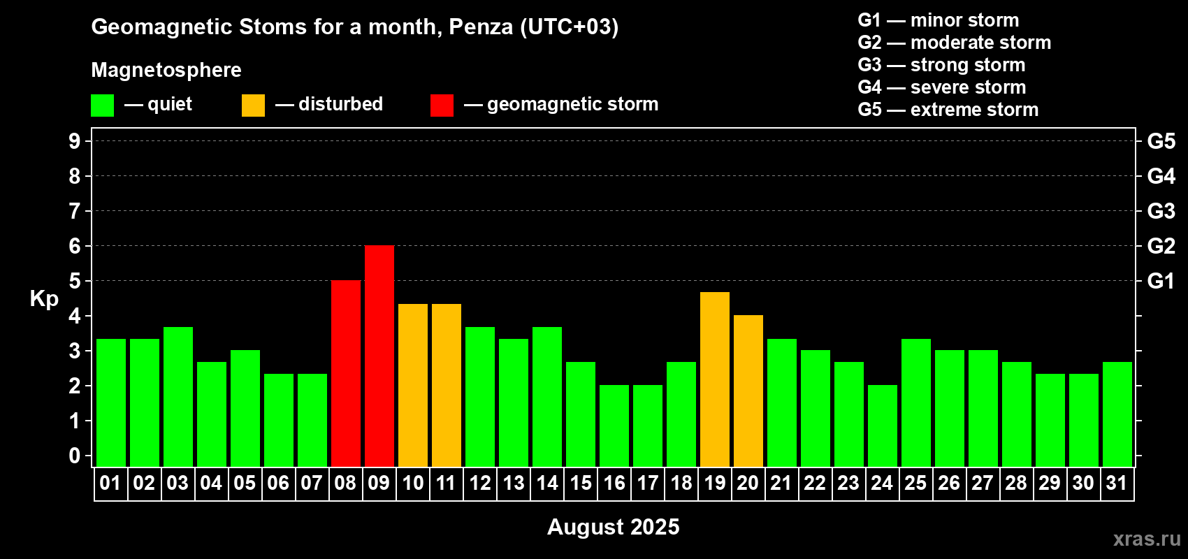 Changes in the maximum daily geomagnetic index Kp in August 2025 for mid latitudes