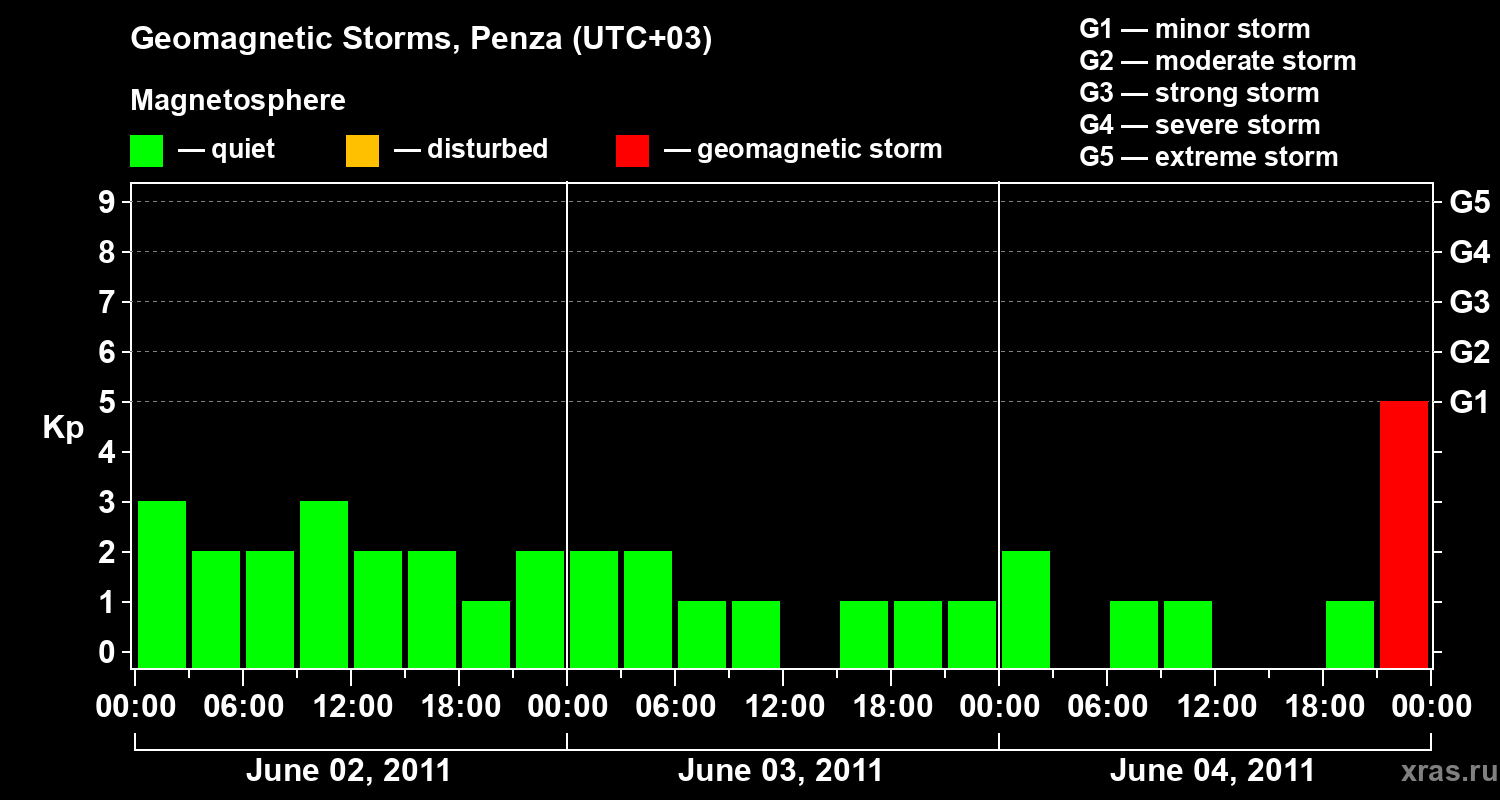 Changes in the geomagnetic index Kp from June 2 to 4, 2011 for mid latitudes