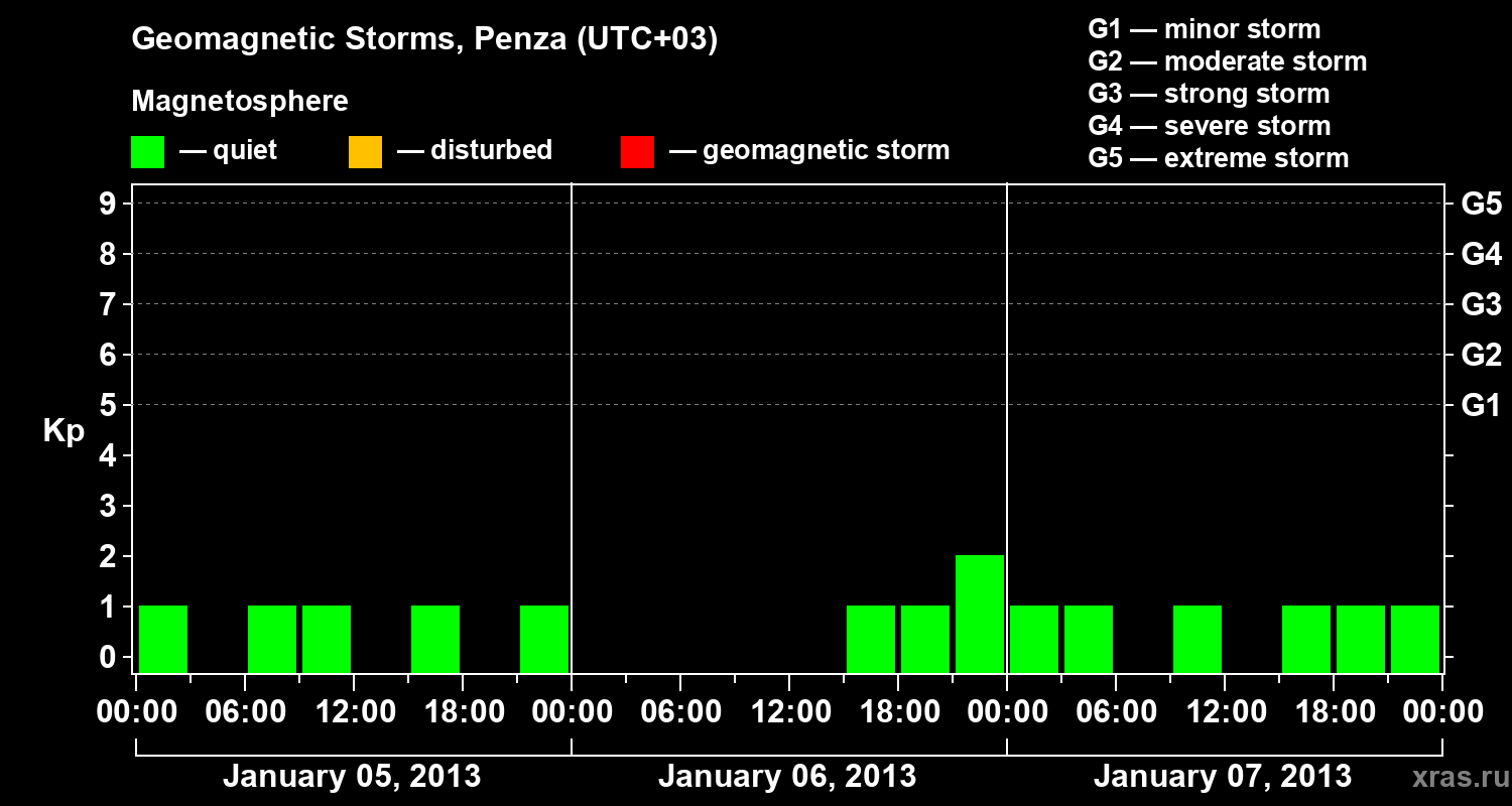 Changes in the geomagnetic index Kp from January 5 to 7, 2013 for mid latitudes