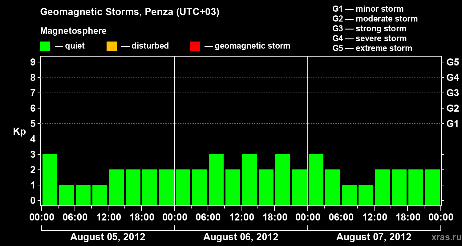 Changes in the geomagnetic index Kp from August 5 to 7, 2012 for mid latitudes