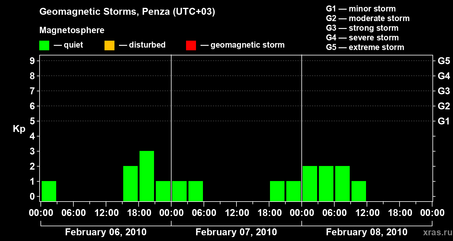 Changes in the geomagnetic index Kp from February 6 to 8, 2010 for mid latitudes