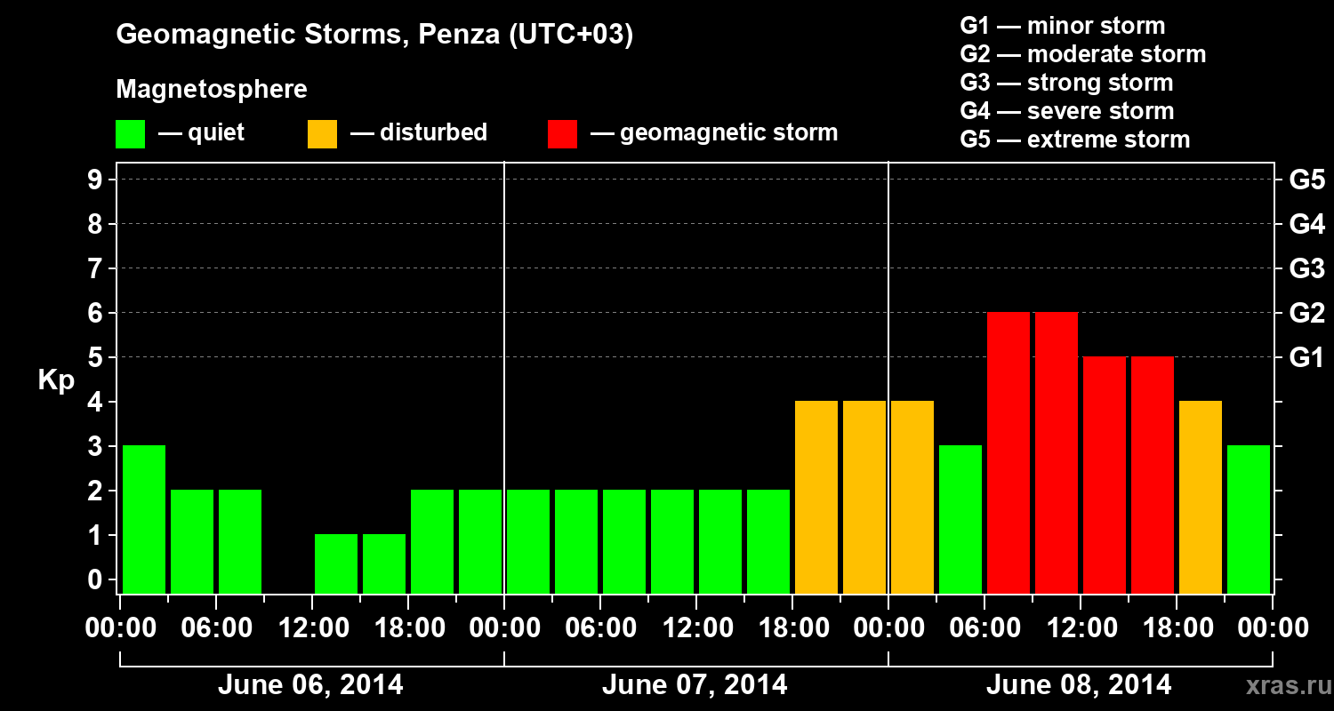 Changes in the geomagnetic index Kp from June 6 to 8, 2014 for mid latitudes