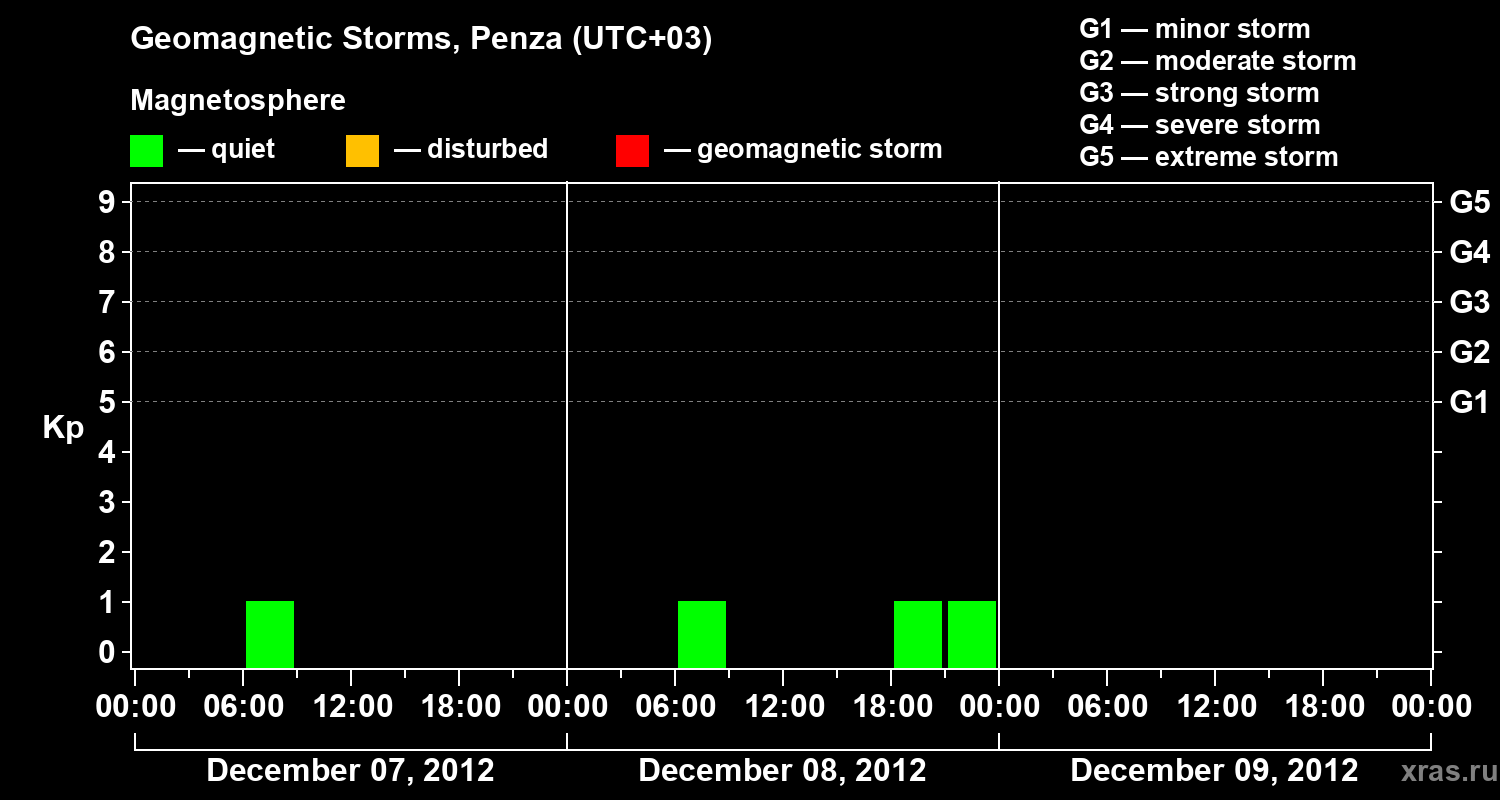 Changes in the geomagnetic index Kp from December 7 to 9, 2012 for mid latitudes