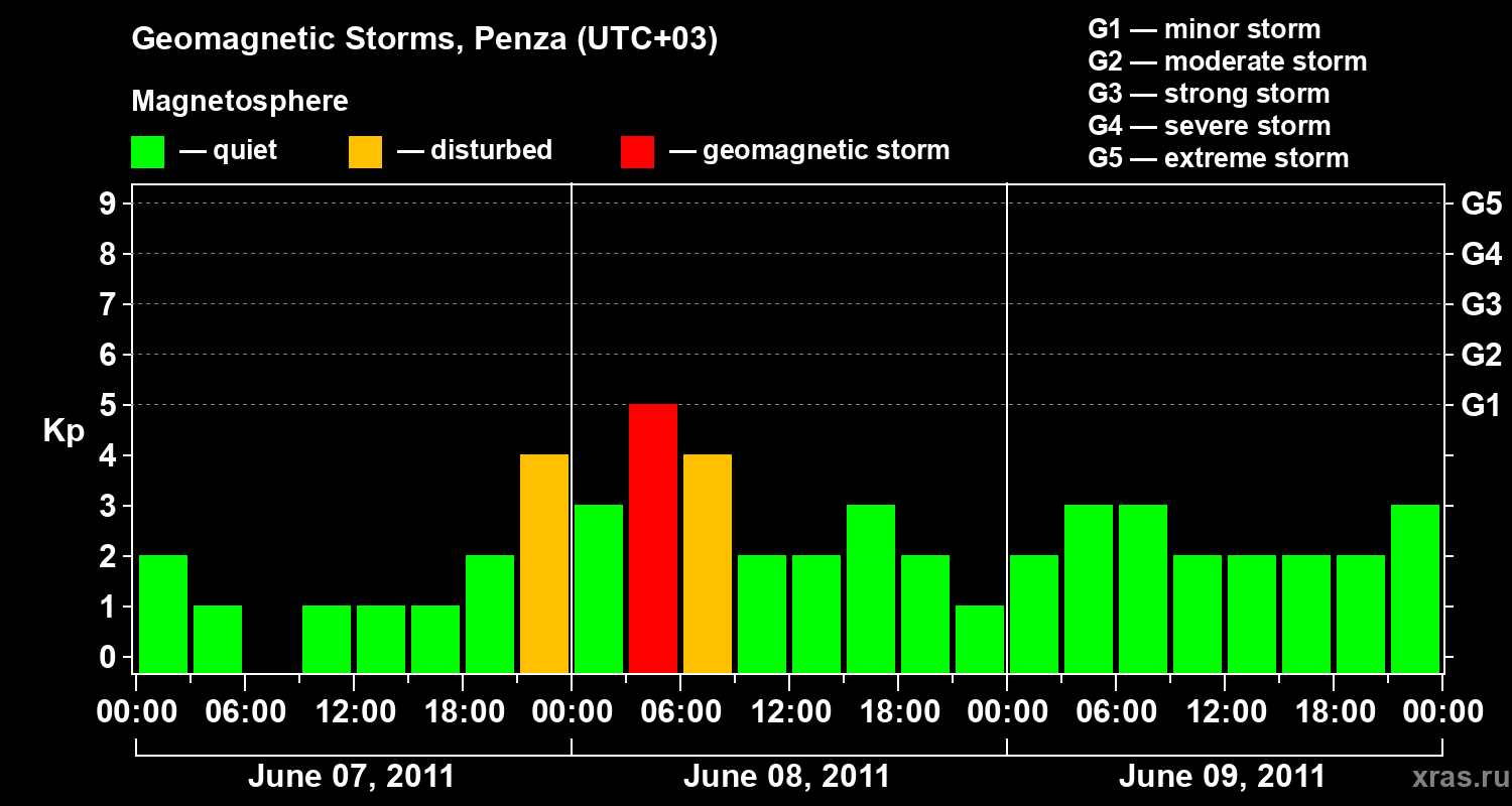 Changes in the geomagnetic index Kp from June 7 to 9, 2011 for mid latitudes