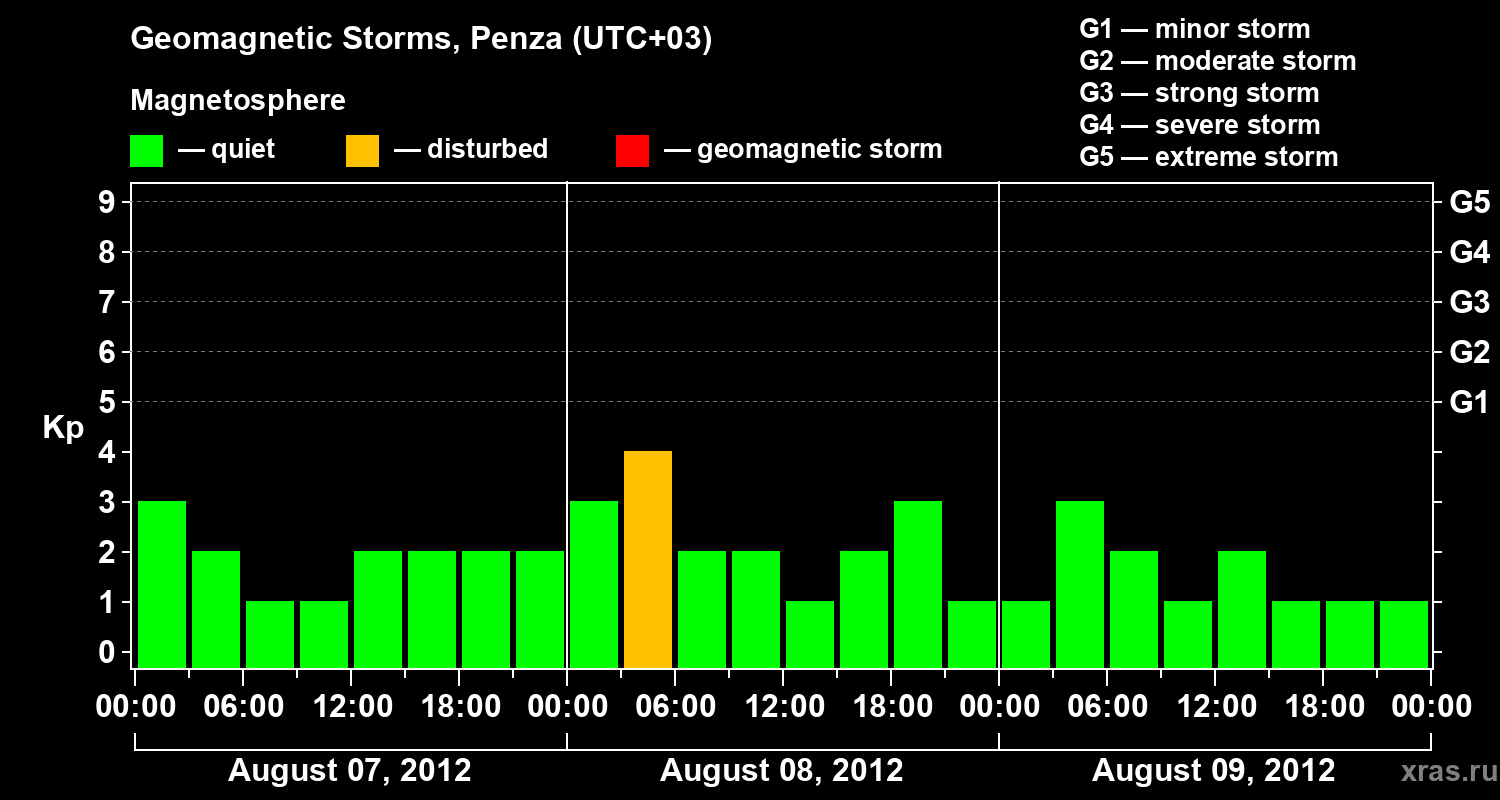 Changes in the geomagnetic index Kp from August 7 to 9, 2012 for mid latitudes