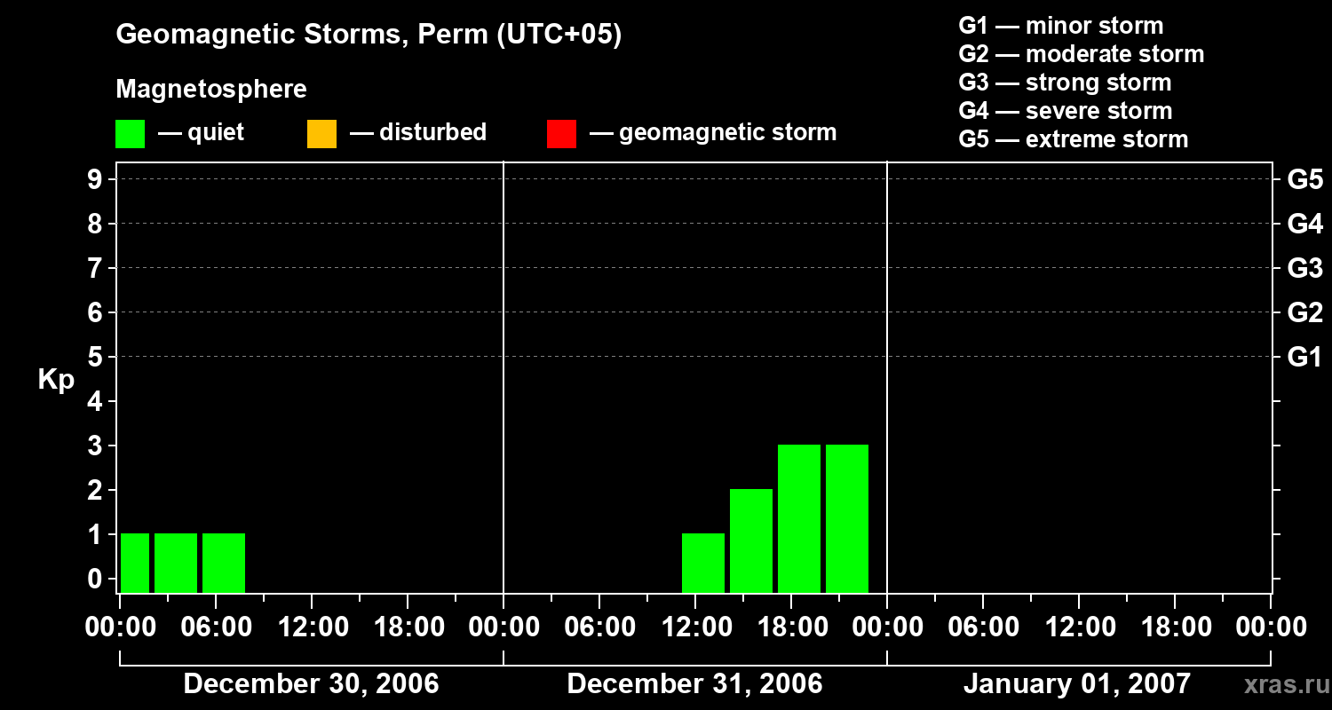 Changes in the geomagnetic index Kp from December 30, 2006 to January 1, 2007 for mid latitudes