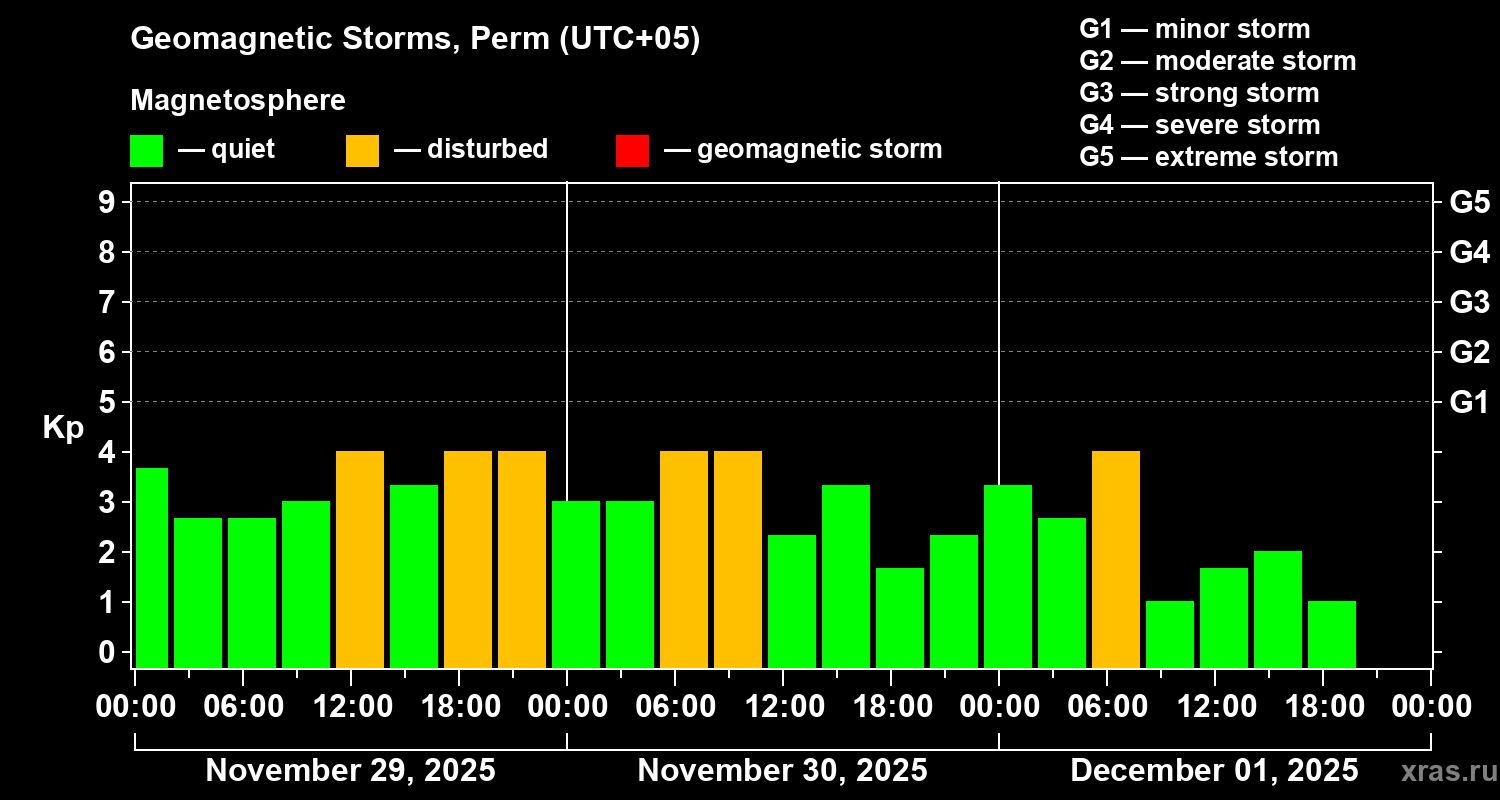 Changes in the geomagnetic index Kp from November 29 to December 1, 2025 for mid latitudes