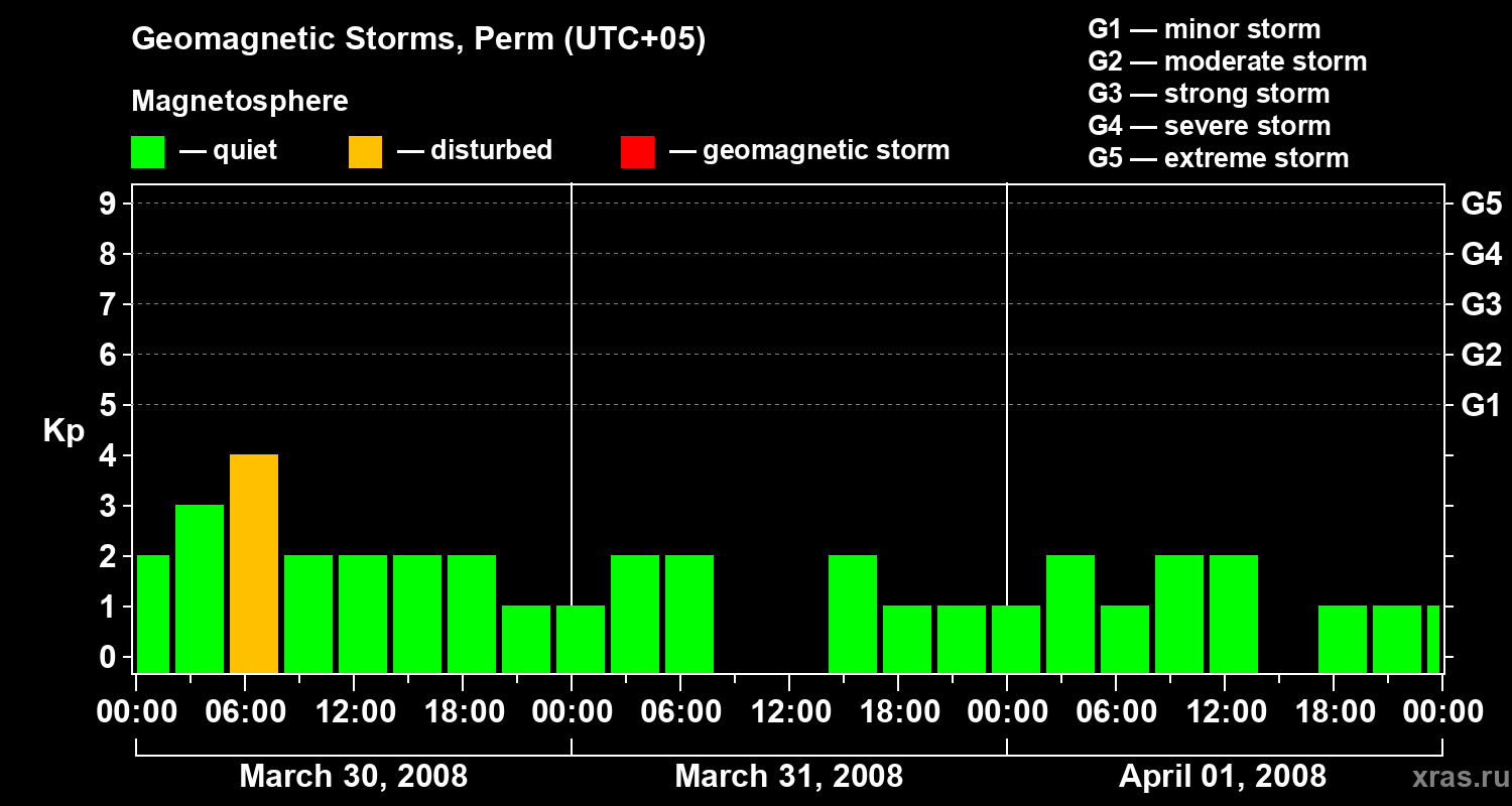 Changes in the geomagnetic index Kp from March 30 to April 1, 2008 for mid latitudes