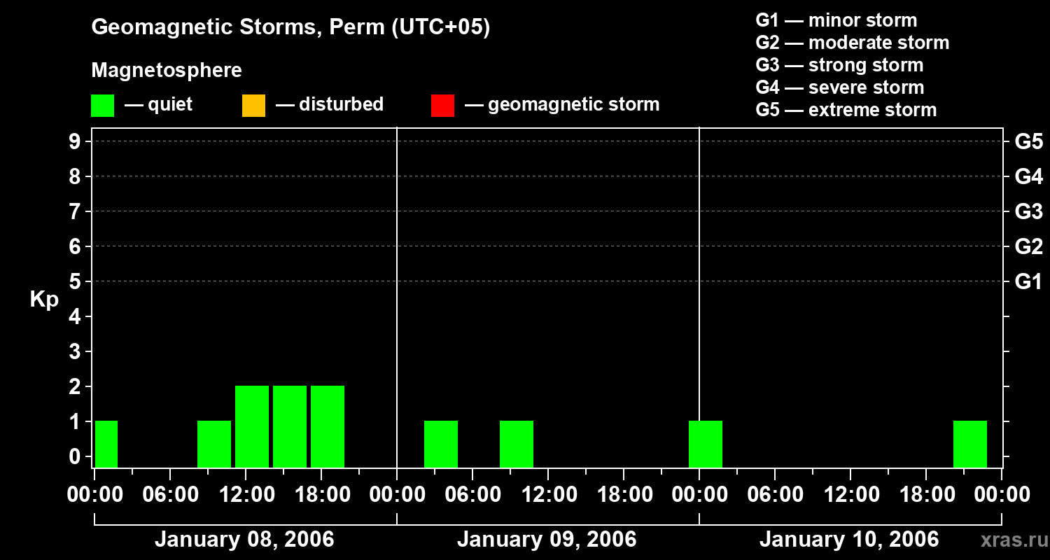 Changes in the geomagnetic index Kp from January 8 to 10, 2006 for mid latitudes