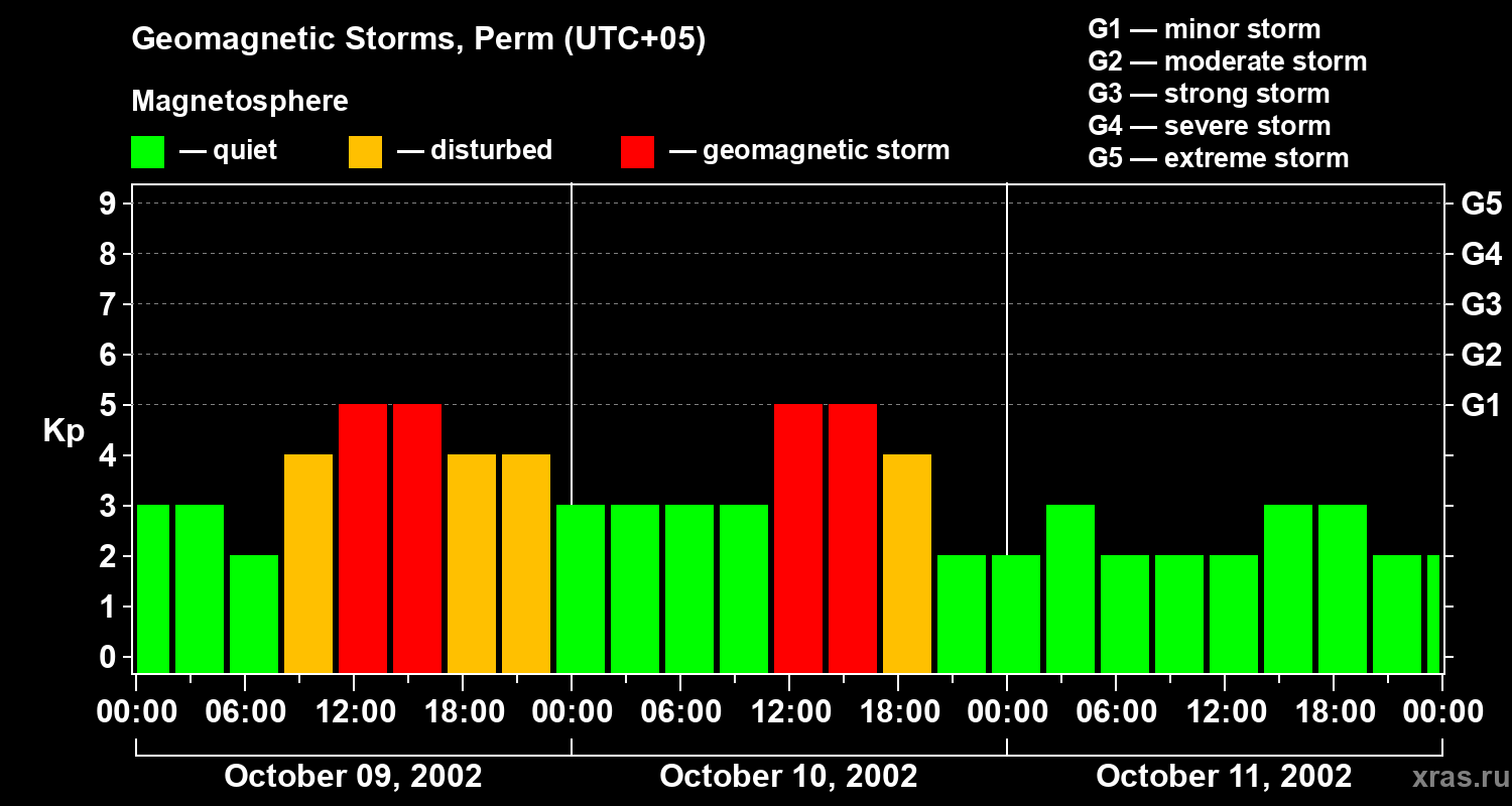 Changes in the geomagnetic index Kp from October 9 to 11, 2002 for mid latitudes