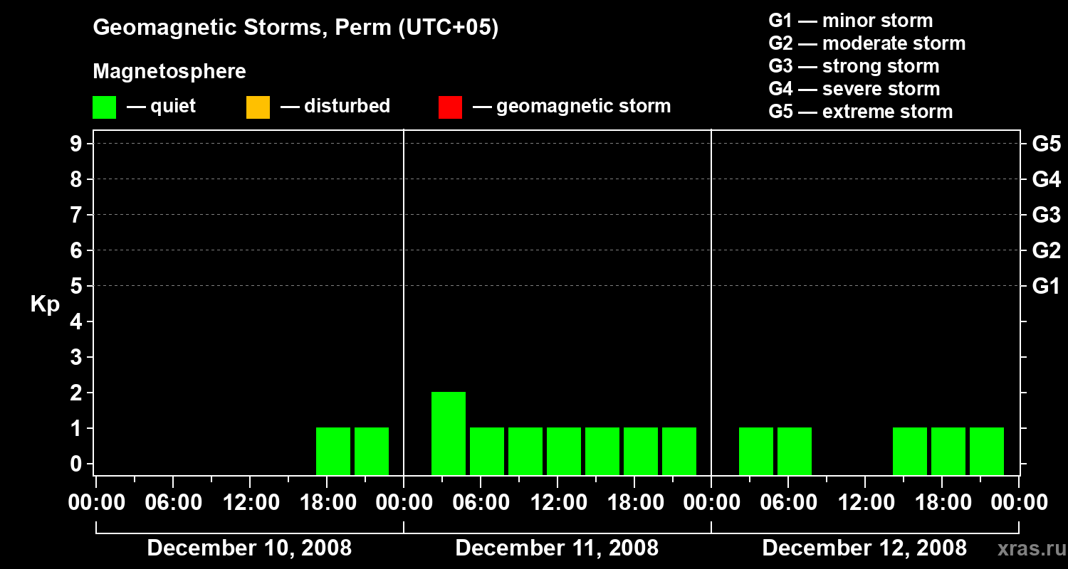 Changes in the geomagnetic index Kp from December 10 to 12, 2008 for mid latitudes