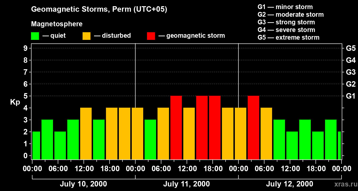 Changes in the geomagnetic index Kp from July 10 to 12, 2000 for mid latitudes