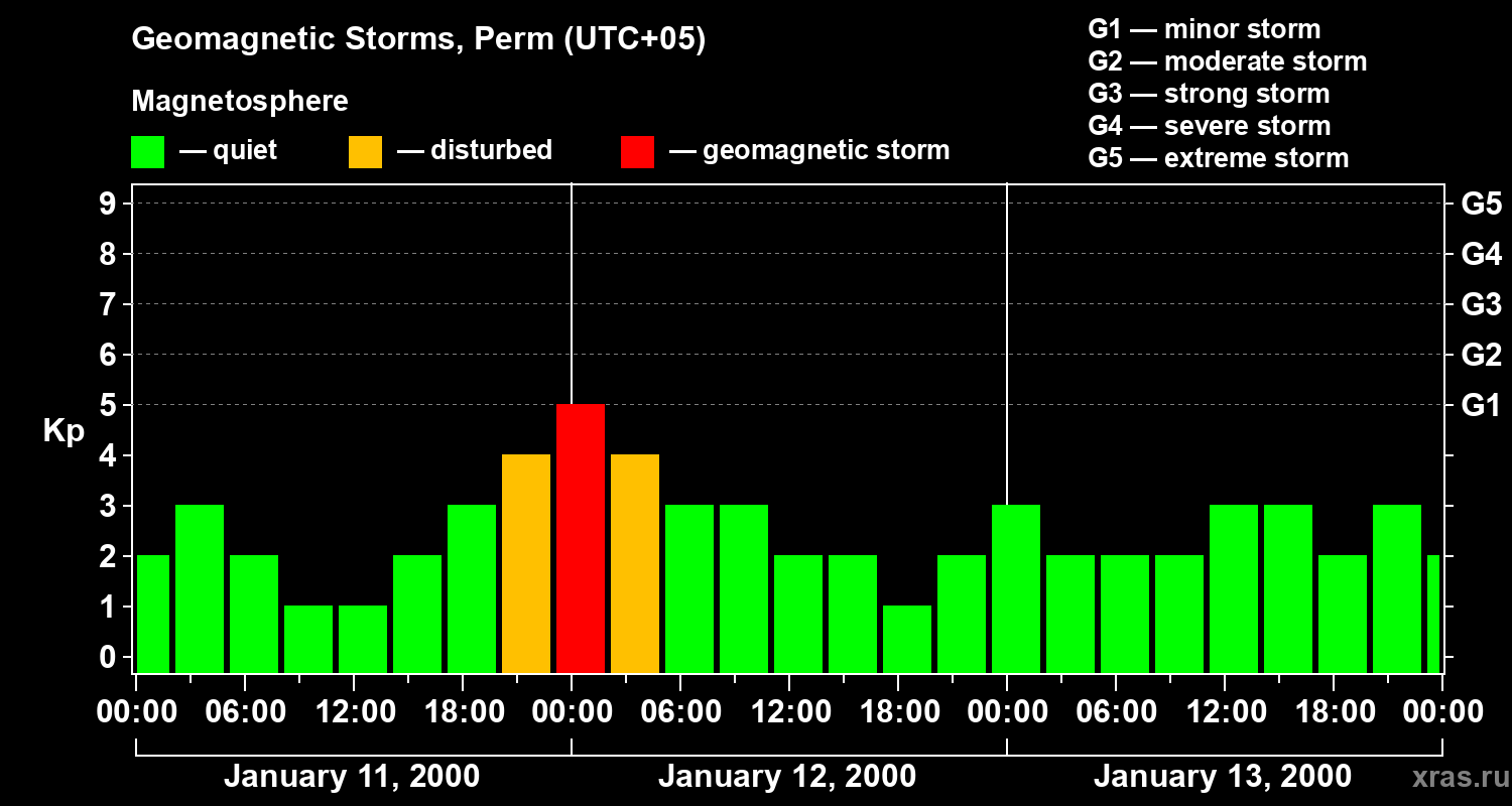 Changes in the geomagnetic index Kp from January 11 to 13, 2000 for mid latitudes