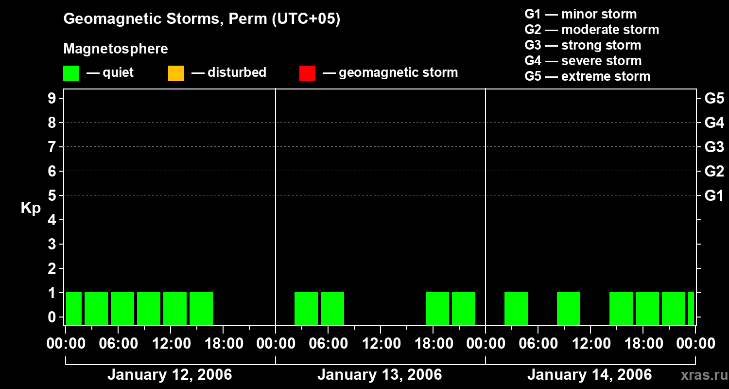 Changes in the geomagnetic index Kp from January 12 to 14, 2006 for mid latitudes