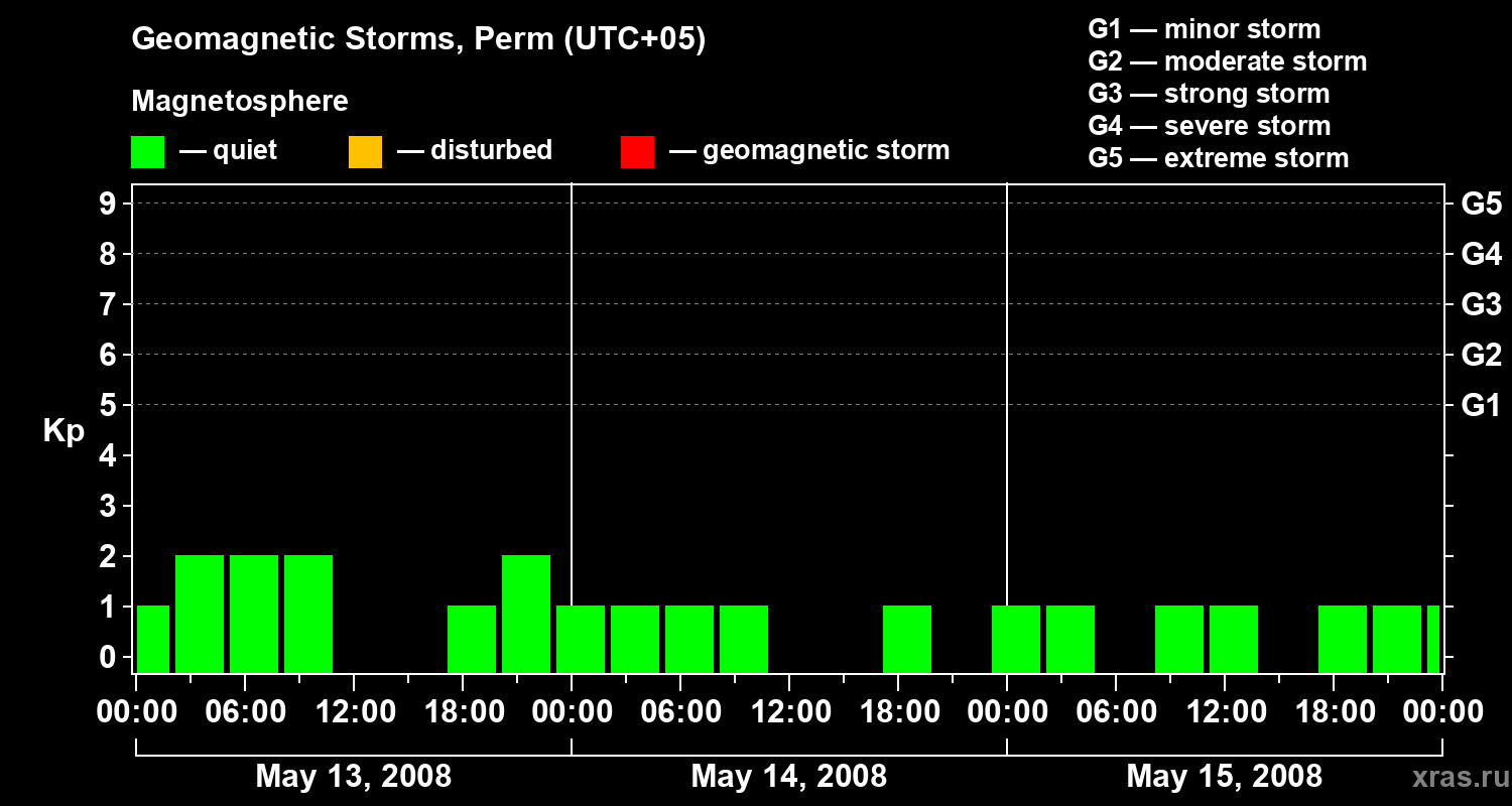 Changes in the geomagnetic index Kp from May 13 to 15, 2008 for mid latitudes