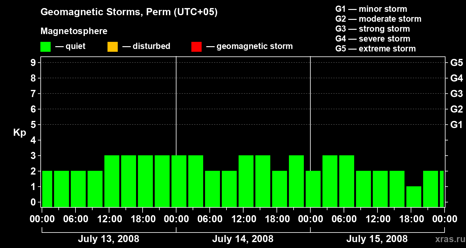 Changes in the geomagnetic index Kp from July 13 to 15, 2008 for mid latitudes