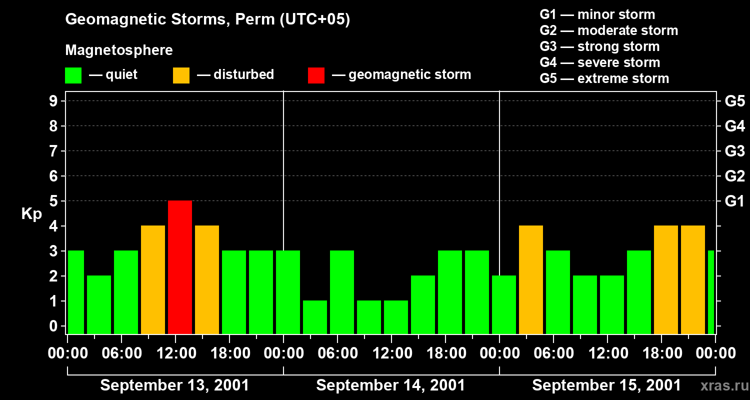 Changes in the geomagnetic index Kp from September 13 to 15, 2001 for mid latitudes
