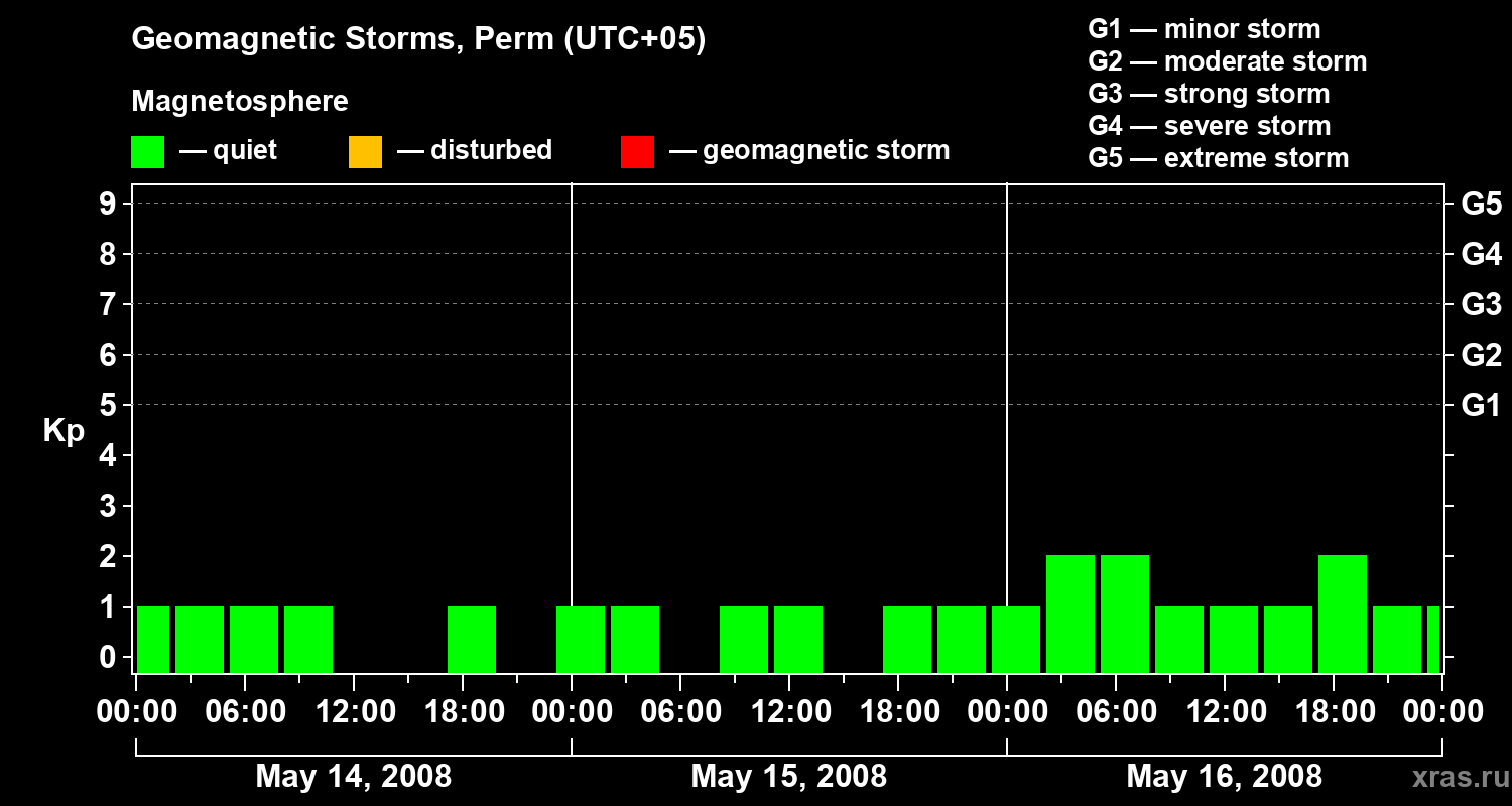 Changes in the geomagnetic index Kp from May 14 to 16, 2008 for mid latitudes