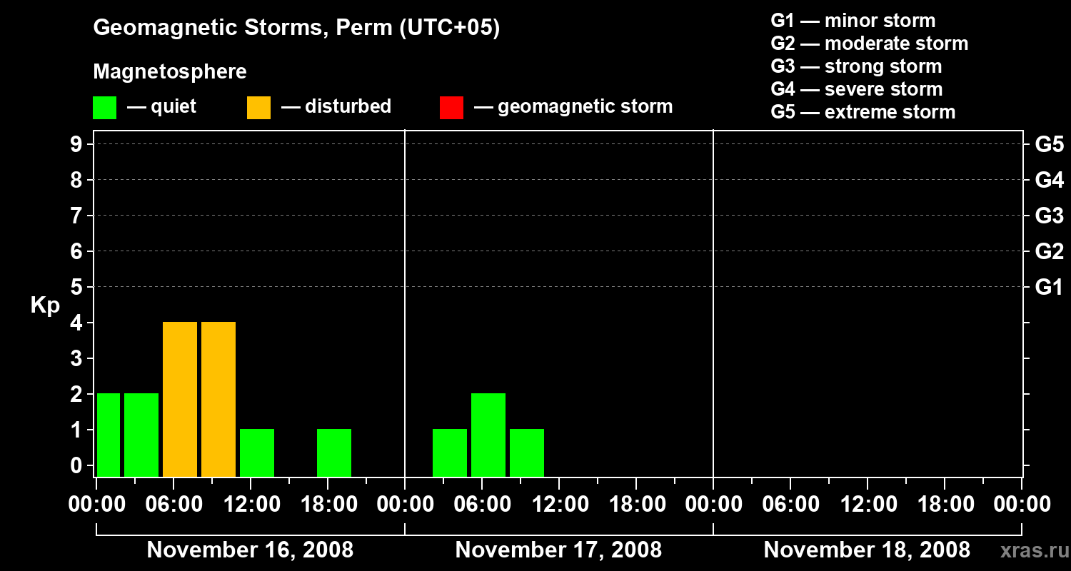 Changes in the geomagnetic index Kp from November 16 to 18, 2008 for mid latitudes