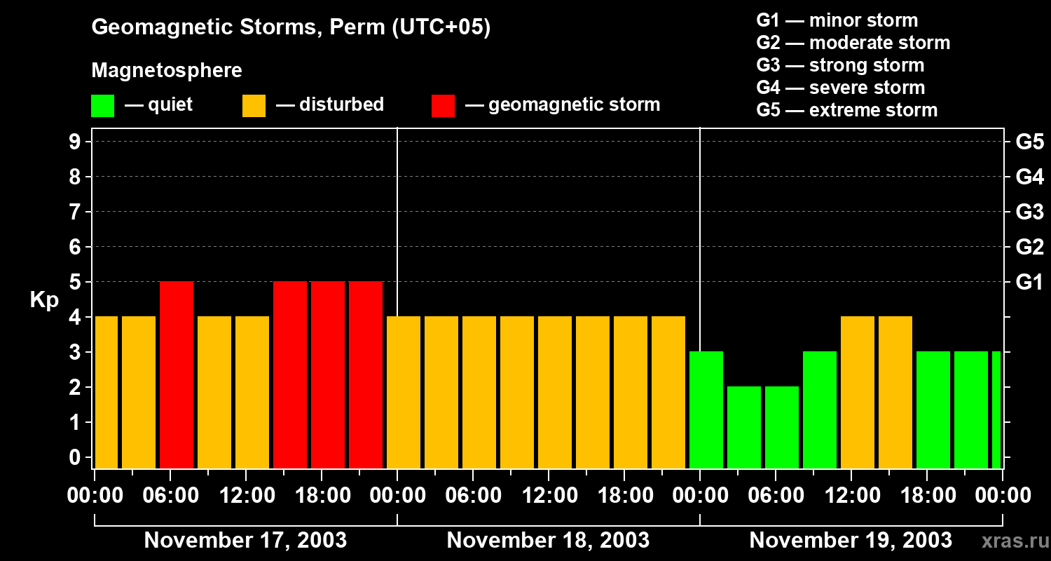 Changes in the geomagnetic index Kp from November 17 to 19, 2003 for mid latitudes