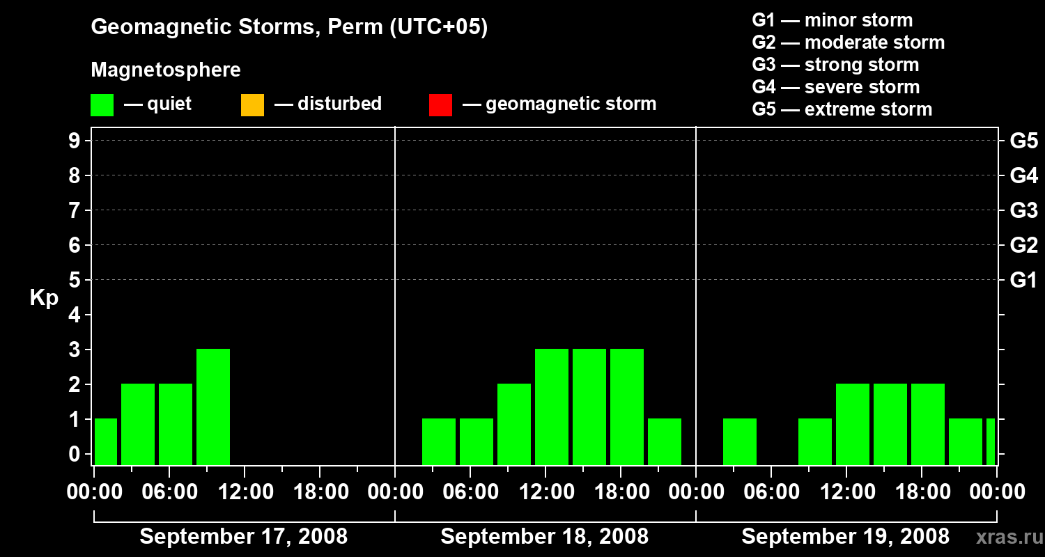 Changes in the geomagnetic index Kp from September 17 to 19, 2008 for mid latitudes