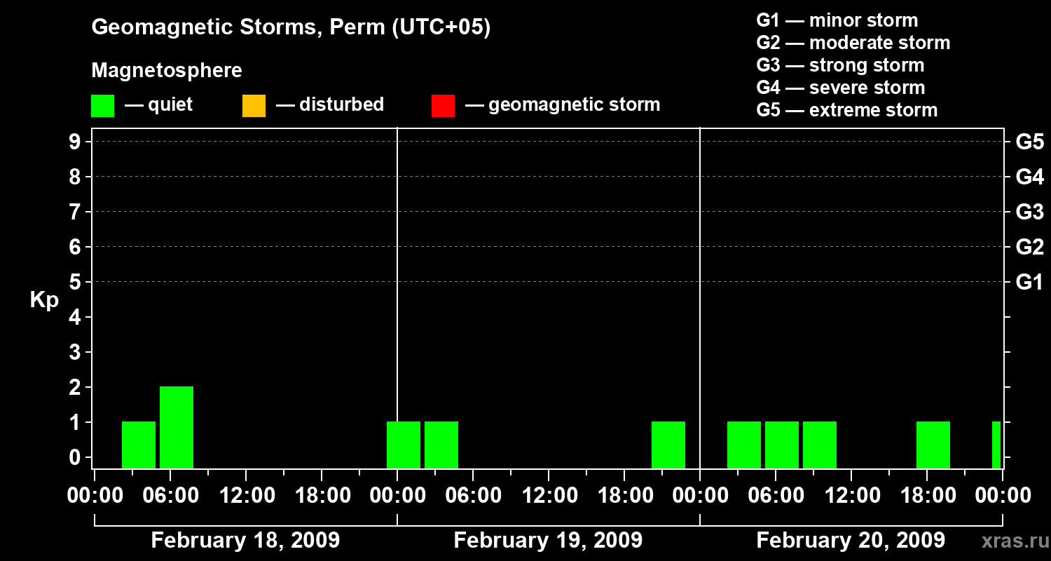 Changes in the geomagnetic index Kp from February 18 to 20, 2009 for mid latitudes