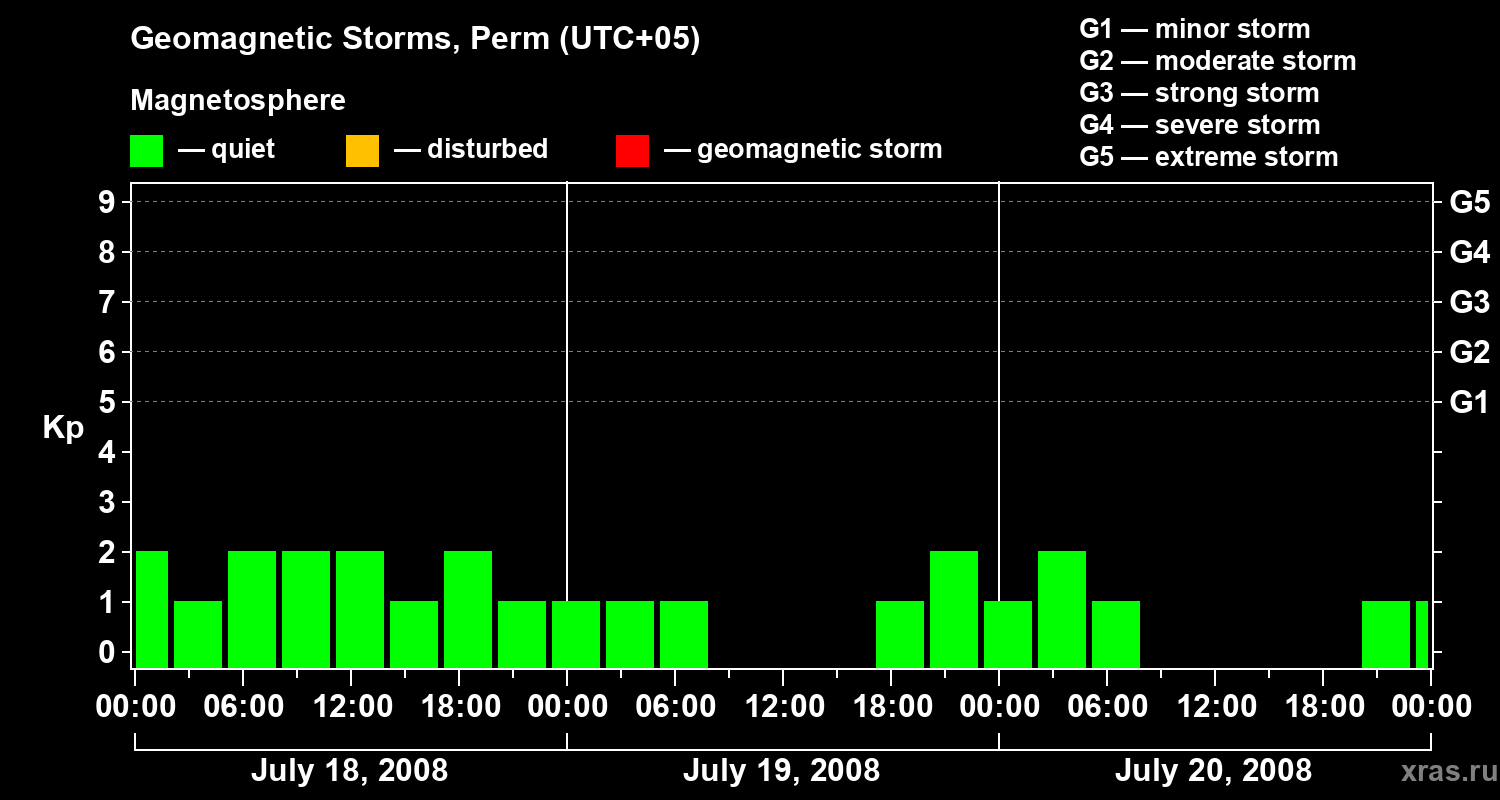 Changes in the geomagnetic index Kp from July 18 to 20, 2008 for mid latitudes