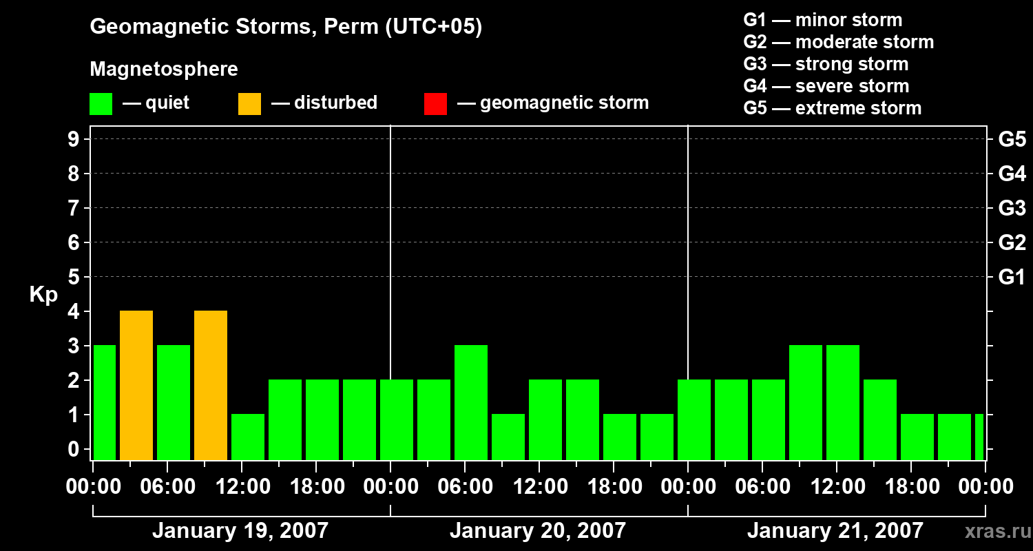Changes in the geomagnetic index Kp from January 19 to 21, 2007 for mid latitudes