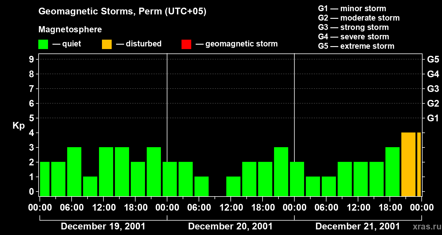Changes in the geomagnetic index Kp from December 19 to 21, 2001 for mid latitudes