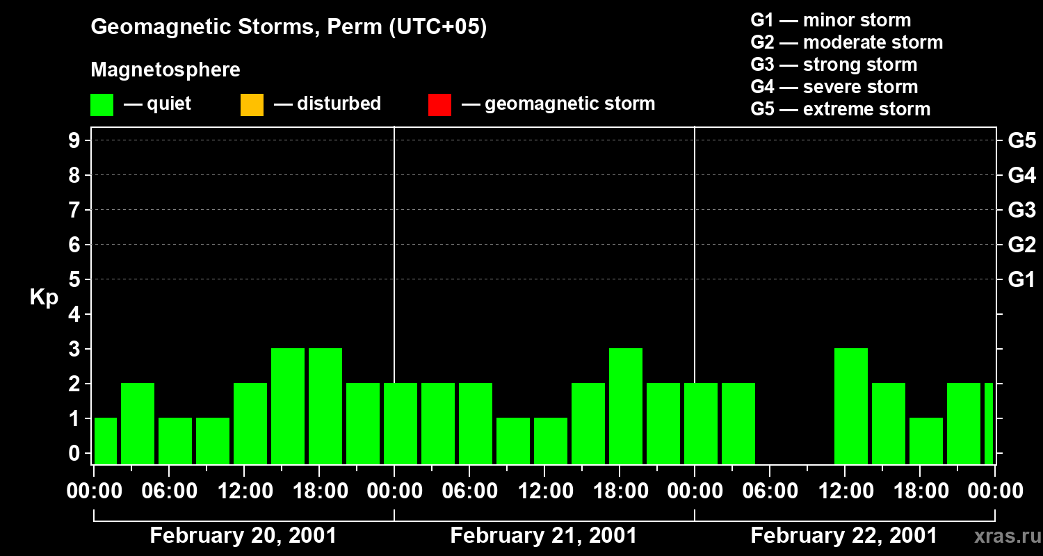 Changes in the geomagnetic index Kp from February 20 to 22, 2001 for mid latitudes