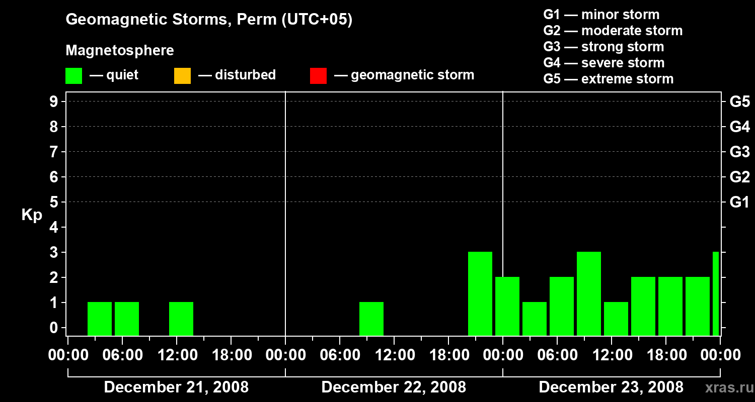 Changes in the geomagnetic index Kp from December 21 to 23, 2008 for mid latitudes