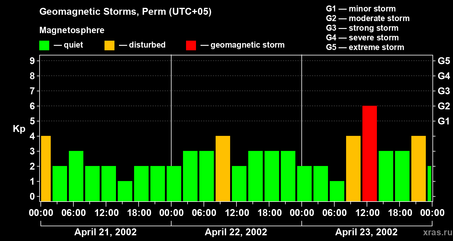 Changes in the geomagnetic index Kp from April 21 to 23, 2002 for mid latitudes