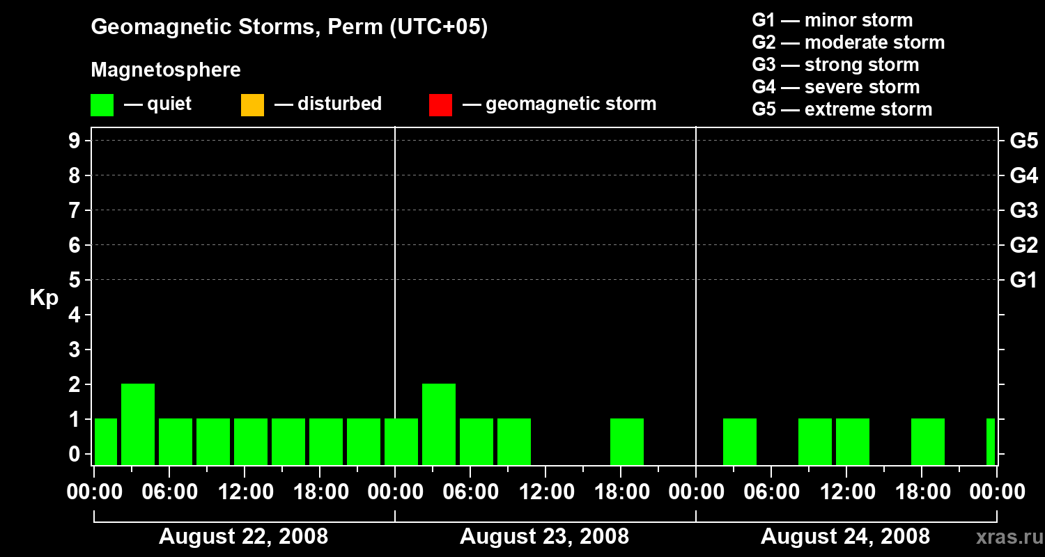 Changes in the geomagnetic index Kp from August 22 to 24, 2008 for mid latitudes