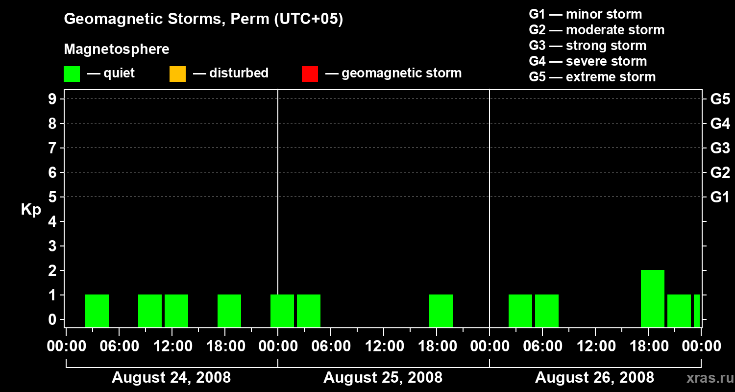 Changes in the geomagnetic index Kp from August 24 to 26, 2008 for mid latitudes